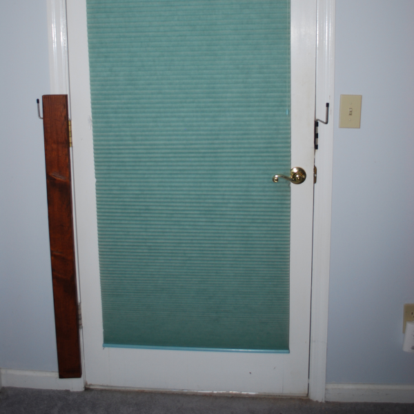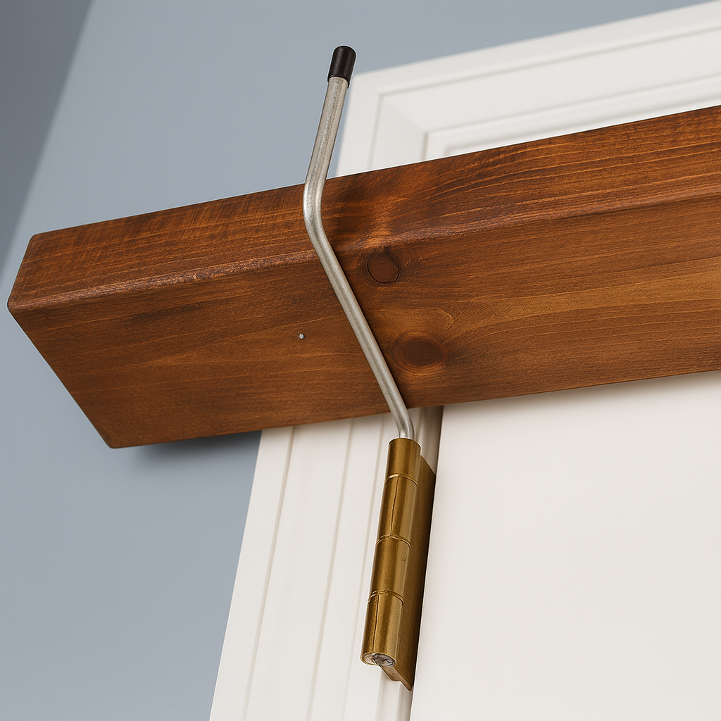 - Add the 2x4 bar — Cut to size (2 inches past trim on each side), hang on pins, and swing into place to lock in seconds.
