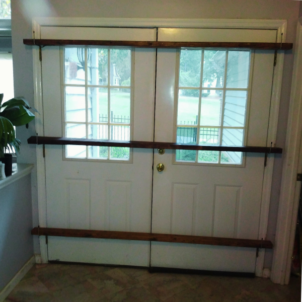 - Double door setup — Install pins on both doors, place the 2x4 bar across, and swing pins inward to lock.